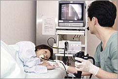 貧血や腹痛の原因を調べる際にも、内視鏡診察をします。食道・胃・十二指腸に発生した潰瘍、炎症、腫瘍、ポリープなどを診断するため、組織検査のため病変の一部を摘みとってくること(生検)もあります。また、内視鏡で病変部位を見ながら切除し治療することもあり、これは外来で行うことができます。当院では従来より細めの内視鏡を使い、異物感を少なくするよう心がけています。また浅い麻酔を併用することで楽に検査が受けられます。緊張しやすい方は遠慮なくお申し付けください。